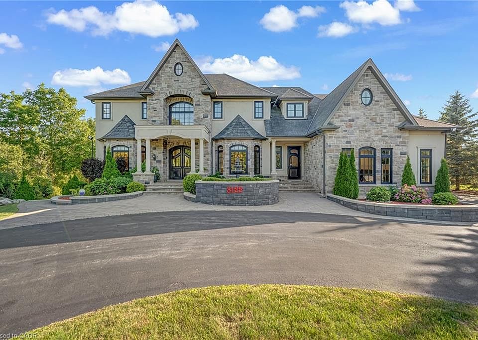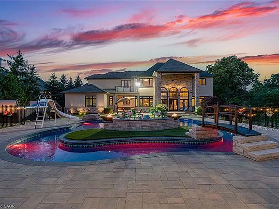 LUXURY| Captivating Setting | Custom Jay Robinson Estate | 1.95 Acres of Refined Living | 5 Bed | 6 Bath. Custom-built estate by Jay Robinson. Spanning nearly 7,500 sq. ft. of meticulously crafted living space, unmatched blend of luxury, comfort, & privacy. Nestled amidst conservation lands & scenic horse farms. Inside features: soaring 18-foot vaulted ceilings, a dramatic limestone feature wall, custom millwork, complete-home Sony sound system perfect for entertaining or quiet evenings in. The chef-inspired gourmet kitchen is equipped w/premium appliances by Wolf | Liebherr | Marvel |Miele | Fisher & Paykel. The luxurious primary suite features dual walk-in closets, spa-like ensuite, & private balcony overlooking tranquil countryside vistas. Designed for year-round efficiency & comfort, the home inc. dual furnaces, A/C units, wells, hot water tanks, triple sump pump system w/ battery backup. A Generac generator- 20KW providing full-home power assurance w/ a 200-amp panel. Oversized 3-car garage complete w/2- EV chargers, reflecting the property's commitment to modern sustainability. Outdoors, enjoy a resort-style pool complete w/built-in lazy river & cascading waterfall. Swim spa hot & professionally landscaped gardens. A basketball pad is perfect for recreational use & potential retrofit for multi-sport play, inc. Pickleball. Night-lit gardens w/ water feature further elevate the ambiance. Cabana w/ 5-piece bath, built-in BBQ, & dedicated al fresco dining area. Recreational amenities include a mini putt golf course & expansive open space designed for entertaining. The lower level offers a separate walk-up entrance and is primed for customization with rough-ins for a kitchen and 2- bathroom is ideal for a future in-law suite or guest retreat. Potential for an elevator installation. This exceptional rural estate offers complete privacy, timeless style, a true resort-like lifestyle, minutes from top-tier amenities such as Costco & renowned Bruce Trail.