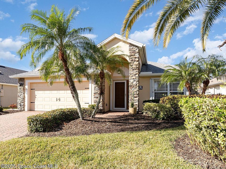 The home itself is move-in ready and features solid block construction with elegant stone-accented exterior, tropical landscaping, a screened lanai overlooking lush greenery, and a recently sealed paver driveway. Major updates include a NEW HVAC (2025), Roof (2018), and accordion hurricane shutters throughout (including the front door) for peace of mind.