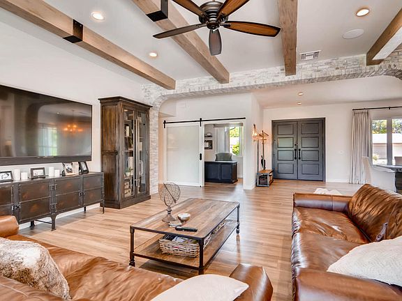Completely rebuilt in 2016! Stunning single-level ranch farmhouse in Lower Arcadia. Open great room floor plan with soaring 12' ceilings, rustic wood beams and white washed red brick accents. Kitchen boasts large walnut center island, SS appliances, 6 burner gas range and built in wine chiller. Custom cabinetry throughout. Master suite is something to be desired with dual marble vanities, large jacuzzi tub, steam shower, luxurious his/hers closets and private exit to the backyard oasis. Three guest suites are located on the opposite side of the home plus a beautiful office and media room with seating for 8. Perfect home for entertaining! Expansive sliding doors open up to a resort style backyard featuring; a large covered patio, built-in BBQ area, and exterior sound system. Heated pool and jacuzzi with remote feature through app. Garage complete with electric vehicle charger. Home is equipped with surveillance cameras, lights and alarm. Wonderful private and quiet street on a cul-de-sac lot, just over 1/3 acre. You will love the top quality finishes used throughout this custom home!