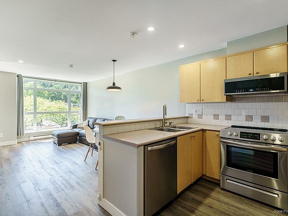 This pet-friendly 1-bedroom, 1-bath unit with a large den at 3122 Saint Johns Street in central Port Moody offers a delightful retreat. Just a 7-minute walk from major transit hubs (West Coast Express, Moody Center, Inlet Centre), it provides easy access to Brewer's Row, shops, restaurants, and Rocky Point Park. The gourmet kitchen features stainless steel appliances, ample counter space, and a breakfast bar. The living area extends to a sizable covered balcony. Enjoy luxury vinyl flooring, a gas fireplace (rent included), in-suite laundry, and LED lighting. Building amenities include EV charging, a car wash, gym, sauna, indoor pool, hot tub, a green courtyard, and a kid's playroom. The unit comes unfurnished with one secure underground parking space and a large storage locker.