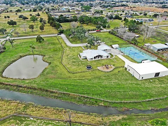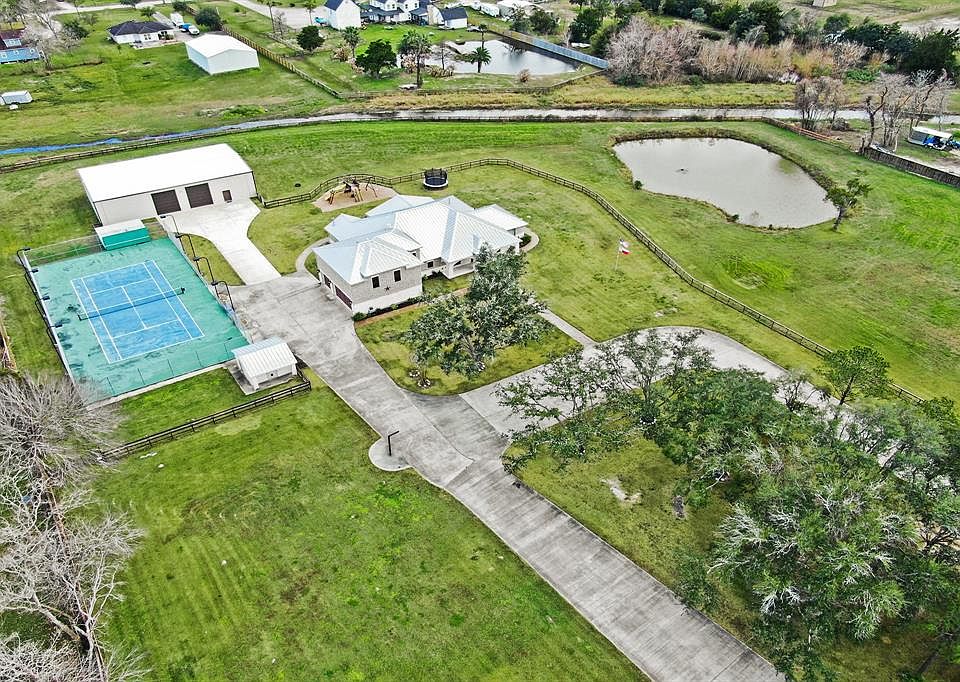 5.5 acres of country living at it's finest! This stunning country estate includes a spacious, custom built home as well as a 4,000 SF metal building with a 1,150 SF guest suite, stone storage building with dog kennel, full size lighted tennis court, stone animal pole barn, pond and so much more! Plenty of room for your boat and RV! The main home boasts 5 bedrooms, custom cabinetry and built-ins, LED lighting and plantation shutters throughout, 2 stone fireplaces, a huge media/theater room and game room, and an impressive covered back patio area complete with outdoor kitchen, perfect for entertaining! The home also has a metal roof, tankless hot water heater, and a large generator. Property has an underground sprinkler system, mosquito misters, LED lighted pillars and is fully fenced. Too many extras and features to list! Schedule your appointment today!