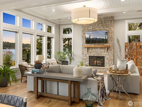 Experience lakefront living at its finest with 96 feet of prime waterfront on desirable East Lake Sammamish. Custom-built in 2013 by Mastercraft NW, this west-facing home captures stunning sunsets and seamless indoor-outdoor living. The open-concept great room features an accordion door to a covered patio and yard, perfect for entertaining lakeside. A gourmet kitchen offers a large island, quartz & marble countertops, and high-end appliances framed by new oak hardwood floors. The primary suite is a true retreat with a double-sided fireplace, 5-piece bath, heated floors, and soaking tub. Three ensuite bedrooms, a flexible main-floor room, outdoor shower, and new dock with boat lift complete this modern waterfront gem.