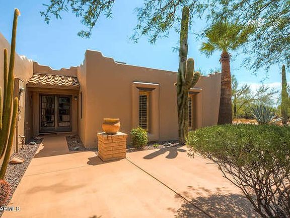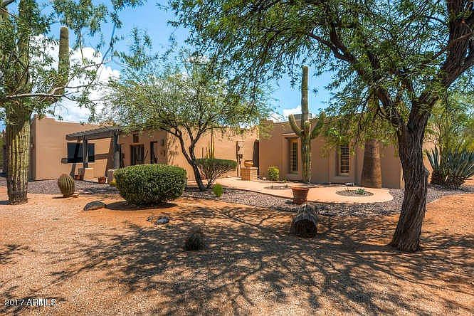 Very well maintained and cared for territorial home on 2 acres and no HOA! Wonderful bright kitchen where you have a Cardinal visit on a daily basis. Dining area with French doors open to patio and beautiful backyard; formal living room with wood burning fireplace (bay window "bench" sections open and are cedar lined for storage) and a cozy family room with French doors opening to a front patio area. Plenty of areas outside to relax and enjoy the sunrise/sunsets and the wildlife frequenting the desert area directly behind the fence line. Plantation shutters. Skylights in bathroom. Cool off in your sparkling pool on a hot summer day and a grassy area for the kids or pets! Owner recently fenced in the North side of the backyard with a custom wrought iron/rock fence adding artistic element.