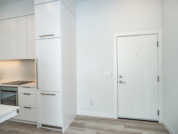 The modern unit features an open concept kitchen, quartz countertops, stainless steel appliances, in-suite washer and dryer, bright living room with access to the balcony. Heat, water, and 1 underground stall are included in the rent.