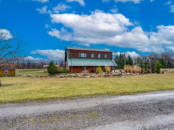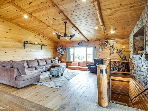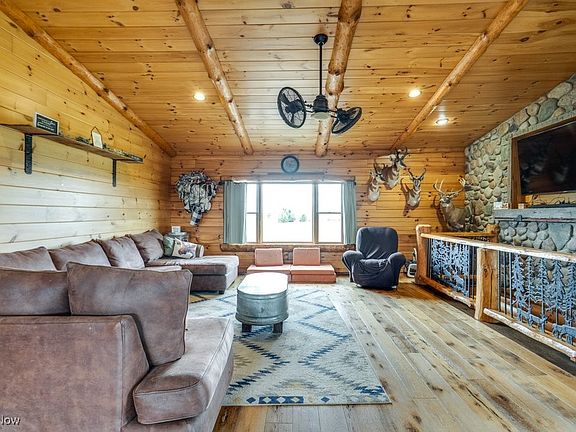 This stunning 2,600 sq. ft. log home combines rustic charm with modern amenities. Situated on 6.86 acres, this property features a spacious open floor plan that creates a warm, welcoming atmosphere. The heart of the home is the kitchen, equipped with top-of-the-line stainless steel appliances, beautiful American Chestnut cabinets, and unique cement countertops. A half-circle island serves as a central gathering place, perfect for meal prep or casual conversations. The home is designed for comfort with radiant heat throughout, including the spacious 24 x 64 outbuilding with enclosed 10 X 64 lean-to that also has water access and is heated. The walk-out back deck, measuring 22 x 8, overlooks the serene pond, offering a tranquil retreat. Inside, the master bath features an impressive 8 x 4 cement shower, and custom log furniture complements the rustic feel of the home. For those with additional needs or projects in mind, there is the potential to add a few rooms off the oversized 3-car garage. The property also features a 12 x 42 camper carport, and a pasture ideal for animals, providing ample space for livestock or recreational activities. The oversized garage offers plenty of room for storage or vehicles, and with the radiant heat, it’s usable year-round. The outbuilding's 10-foot-high ceilings provide generous space for workshops, storage, or other purposes. The front yard was reseeded in the fall of 2024. This home truly brings together the beauty of natural wood with modern luxury, making it an ideal retreat or family home.