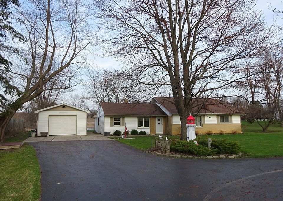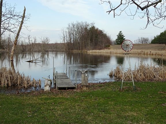 Charming ranch on 5 acres with pond, wetlands, wildlife, apple & pear trees. This home features spacious room sizes, fireplace in living room, oak kitchen with large dining/sitting room with view of the pond. Oak hardwood floors under some of the carpet. Large laundry/utility room. All the appliances stay. Detached garage. Nicely landscaped. Excellent Schools.