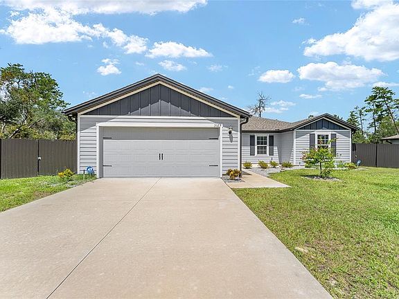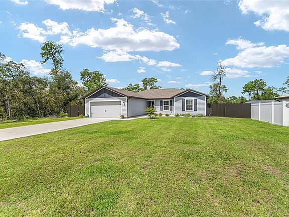 LIKE NEW, 2024 home with 3 bedrooms, 2 bathrooms, flex room and a 2 car garage. As you approach, you'll be greeted by a front patio and stone landscaping, providing great curb appeal. Step inside to discover a bright and inviting living room featuring vaulted ceilings, a ceiling fan, and a sliding glass door leading out to the screened lanai, offering a seamless indoor-outdoor living experience. The entire home boasts luxury vinyl plank flooring, with plush carpet in the bedrooms for added warmth and comfort. The kitchen features an island, granite countertops, under-cabinet lighting, stainless steel appliances, and upgraded light fixtures. The adjacent dining area is perfect for family meals or entertaining. The spacious primary bedroom offers a cozy retreat with vaulted ceilings, carpet, a fan, and blinds. The ensuite bath features a linen closet, a beautifully tiled shower with a glass door, a large single vanity with quartz countertops, and a generous walk-in closet. Bedrooms 2 and 3 are well-sized with carpet, fans, blinds, and closets. The second bathroom offers a quartz vanity and a tub/shower combo with tile accents. The versatile flex room can be used as a home office, playroom, or workout area, complete with a ceiling fan and blinds for added comfort. Enjoy the outdoors on the expansive 38x12 screened lanai, which is perfect for relaxing or entertaining, and features privacy screening and two ceiling fans. The fenced backyard is ideal for pets and privacy, featuring an aluminum fence with two gates. Additional features of this home include gutters and an ADT security system with cameras for peace of mind. Don't miss the opportunity to own this move-in-ready home in Marion Oaks! Schedule a showing today! 3D Tour and Floorplan available upon request.