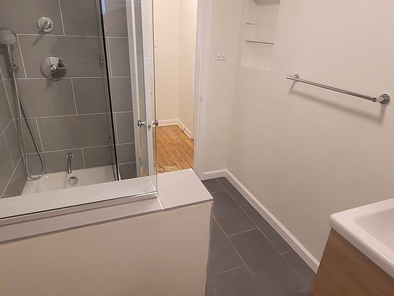 Upgraded bathroom with modern tile shower