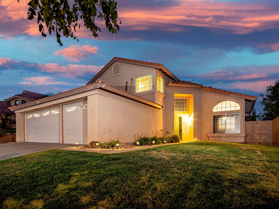 Nestled in the rolling hills of Rancho Vista  this gorgeous, upgraded 2 story, 4 bedroom, 3 bathroom home, with a 3 car garage, fully owned SOLAR, zoned in the sought after westside school district, with no HOAs or mellos-is an absolute must see! Step into the formal entry way where you are greeted by an open and spacious floor plan, vaulted ceilings, and plenty of natural sunlight.  The home opens up to a comfortable family room and dining area.  The home boasts upgraded vinyl plank tile floors in the high traffic areas of the downstairs.  The kitchen is upgraded with stainless steel appliances, painted cabinetry, and newer hardware. The living room that is currently used as an office can be transformed into an entertainer's space right off of the kitchen, which boasts a tiled fireplace for those cool desert evenings. In addition, the downstairs has a spacious bedroom and bathroom with walk-in shower upgraded granite countertops, brushed nickel light fixtures, chrome sink fixtures, with newer translucent shower doors. The laundry room is also downstairs.  Moving up the stairs, to the landing/hallway, you will find plenty of cabinetry for ample storage. Be wowed by the custom themed bedrooms and full bathroom in between the rooms.  The owner's suite is spacious with vaulted ceilings and leads to a large en suite bathroom with upgraded brushed nickel lights fixtures, upgraded sink faucets, dual sinks, granite countertops, and a walk-in closet.  Step out onto the newly upgraded upstairs deck/balcony area and soak in the city skyline and view.  This transformed space has all newly laid decking/roofing materials and industrial crafted wood/steel railing. Fire up the grill and enjoy days and evenings entertaining in the backyard under the patio and in the spacious flat yard/side yard. Side yard also has a new vinyl fence that can be a dog run or great storage area. Centrally located and close to shopping, Marie Kerr park, dining, golfing at the Rancho Vista Gold Course, hiking the hills behind the home, and so much more! See this home today and start living!