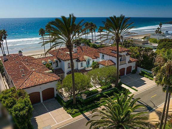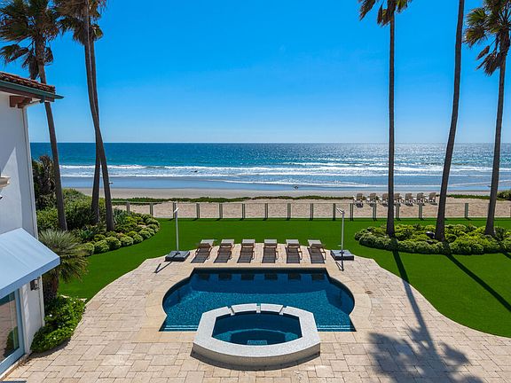Luxury Estate with Ocean Views and Resort-Style Amenities. Nestled along the pristine shores of the Pacific Ocean, this magnificent luxury estate combines modern elegance with Spanish architecture. From its clay tile roof to the breathtaking resort-style courtyard and beyond, this property exemplifies the epitome of coastal living. As you step through the grand foyer's double doors, you're immediately greeted by sweeping ocean views. Tile floors and two-story ceilings adorned with a magnificent chandelier set the stage for the opulence that awaits. To the right of the foyer, there is a grand staircase and a spacious formal living room. High ceilings, built-in speakers, sliding glass doors to the beachside, and a large wood-burning fireplace create a welcoming atmosphere with panoramic ocean vistas. The dining room boasts stone tile floors, coffered ceilings, and French windows that fill the space with natural light. A butler's pantry with stone counters and a Sub-Zero wine fridge connects to the dining area. The kitchen, accessible from the dining room, features tile floors, a dining area with a TV, a built-in desk with a blue backsplash, and a large island with waterfall stone counters. High-end appliances, ocean views, and a hidden Sub-Zero fridge and freezer complete this culinary paradise. A carpeted hallway leads to an elegant office with coffered ceilings, stone tile floors, and a serene courtyard view. Next door, you'll find a full bathroom with stone tile floors, stone counters, a vanity, and a shower stall. A hallway elevator enhances accessibility. The entertainment wing features a large family room with stone tile floors, coffered ceilings, a fireplace, a wet bar, and sliding glass doors leading to the backyard. A movie theater awaits just two steps up from the hallway, equipped with carpet floors, blue abstract walls, sectional seating, and built-ins for concessions. The gym, with stone tile floors, skylights, and a sunroom ambiance, includes a TV, stone counters with built-ins, and a closet with water toy storage. Upstairs, the master suite boasts panoramic ocean views, a massive sitting area, a fireplace, and access to a balcony. The master bath features stone tile floors, double sinks, a jetted tub, a spacious shower, and two water closets. Two generous closets with built-ins provide ample storage. Additional bedrooms include ensuites, including a second master Oceanside, closets, and balconies with courtyard or ocean views. The backyard is an entertainer's dream, with a pool, spa, covered dining area, outdoor kitchen, fire pit, and direct access to "your" low bluff just steps above the sand and sea. Lush landscaping, large palm trees, and outdoor cameras complete this coastal paradise. Experience luxury coastal living at its finest in this exquisite estate with captivating ocean views, lavish amenities, and unparalleled elegance.