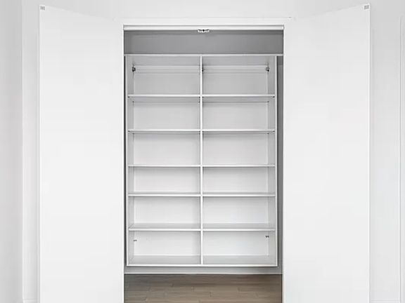 Features space for your full/queen size bed with a large closet with custom California style wardrobe organizers featuring integrated lighting.