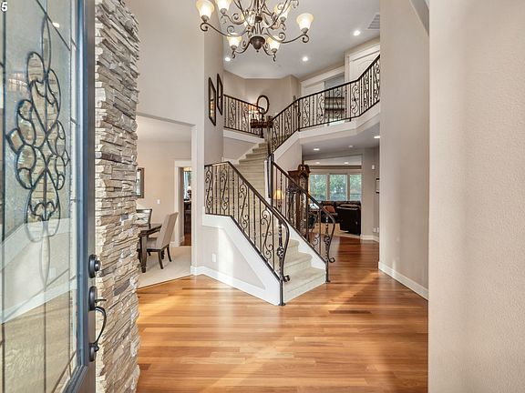 A dream retreat with an amazing backyard oasis in the Forest View subdivision. This stunning home offers a welcoming entry, 4 bedrooms/2.5 baths, warm and inviting interior, featuring Brazilian wood floors, grand custom staircase, large windows & tons of natural light. The grand living room with soaring ceilings, a cozy fireplace as the centerpiece, and the formal dining area adjacent creating a welcoming atmosphere for gatherings. The open-concept kitchen and living area is designed for both comfort and style, a cozy stone fireplace, surround sound and rich wood floors make it perfect for everyday living or entertaining. The chef's kitchen is well equipped with a gas cooktop, SS appliances, microwave and wall oven, refrigerator, granite countertops, pantry, custom cabinets & island with eat-bar. The primary suite is a true sanctuary complete with a french door entry, tray ceiling, walk-in closet and a luxurious ensuite bathroom featuring dual sinks, jacuzzi tub and a separate walk-in shower. The oversized 4th bedroom could also be versatile bonus room for media or a playroom.The main level laundry room has a washer/dryer, sink and room for another fridge or freezer. There is also a separate office if privacy is needed. The deck off of the back of the home has been updated with Trex and custom railing, follow the stamped concrete walk way around the home and it will bring you to the NW timber covered patio with a stone gas fireplace, the perfect spot to relax or entertain year round. This home has thoughtful design elements and premium finishes that create a sense of timeless beauty, making this property an exceptional find for those seeking luxury and a park-like setting.