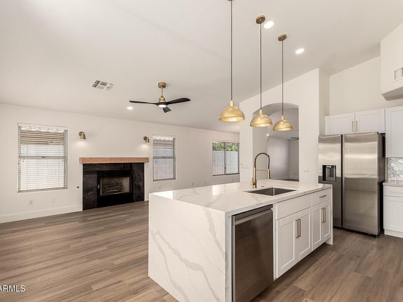 Welcome to this beautifully upgraded 3-bedroom, 2-bath with 3 car garage and pool in North Phoenix! Step inside to an open floor plan with soaring ceilings and luxury vinyl flooring throughout. The spacious living area features a cozy fireplace, while the upgraded kitchen boasts stainless steel appliances and modern finishes—perfect for everyday living or entertaining. New pool resurfaces, flooring, kitchen cabinet, Quartz countertop, stainless steel appliances, Vanity, light, faucet, both showers are brand new, inside and outside paint. Trane AC, Water heater 1 year old, roof was done by previous owner almost 2 years ago. Step outside to your private oasis — a beautifully landscaped backyard with a covered patio, perfect for entertaining or unwinding in style. NO HOA