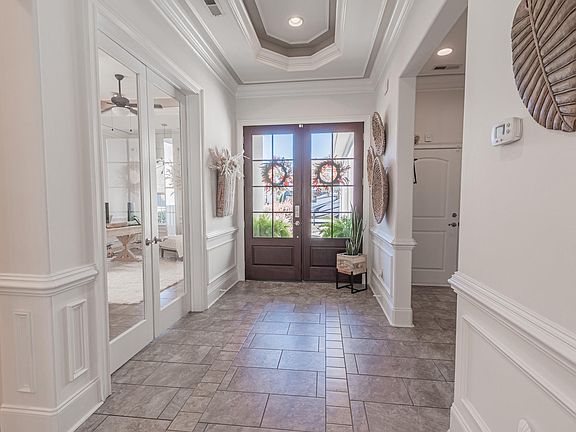 Experience single-level luxury living in this stunning 4-bedroom, 3-bath home perfectly positioned on a serene pond within the sought-after gated community of The Bluffs on the Waterway. This home showcases beautiful wood and tile flooring, an open-concept layout, and detailed custom molding throughout. The inviting living room features a coffered ceiling with fan, cozy fireplace, and a large picture window framing tranquil pond views. The chef’s kitchen is designed for both beauty and function with granite countertops, staggered cabinetry, stainless steel appliances, a work island, breakfast bar, pantry, and adjacent dining area. The primary suite offers a private retreat with a tray ceiling and fan, walk-in closet, direct access to the rear patio, and a spa-inspired bath featuring a water closet, dual vanity, whirlpool tub, and custom tile shower with a large bench, dual showerheads, and a rainfall feature. Two additional bedrooms include ceiling fans and share a stylish Jack-and-Jill bath with vanity and shower. A flexible office or fourth bedroom, an additional full bath, and a spacious laundry room complete the interior. Step outside to a fenced backyard oasis boasting a covered patio with recessed lighting, ceiling fan, and extended patio space—perfect for outdoor entertaining while enjoying the peaceful pond views. Living in The Bluffs means resort-style amenities at your fingertips: two clubhouses (including one on the Waterway), pools, tennis and pickleball courts, basketball, playground, private boat storage and ramp, day docks, and more. And with shopping, dining, entertainment, and the beach just minutes away—you’ll truly have it all. Square footage is approximate; buyers are encouraged to verify.