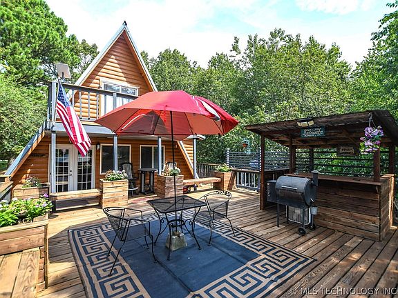 NE Oklahoma Mountain Chalet in the Heart of Flint Ridge! Outdoor living on large deck w/cabana overlooking 1.3-acre, paved street. Main level has Living room, kitchen & dining, one-bedroom, full bathroom walk-in shower & jacuzzi tub, and utility room w/sink. Upstairs 2 bedrooms, half bath, private balcony. ATVs & river toy storage beneath deck in 2-car carport. New 16x32 Workshop turned Mancave has power, (window a/c, refrigerator & couch/chair stays). Washer/dryer & refrigerator less than a year-old stay. Recent Improvements include new floors throughout, interior/exterior paint & stain, vinyl windows & doors, and HVAC heat pump. Relax & enjoy the peaceful lifestyle in the 7,000-acre gated community, with 24-hour security on the beautiful Illinois River, fishing, canoes w/shuttle, golf, clubhouse, swimming pools, mini-golf. Furnishings negotiable. Realtor must accompany.