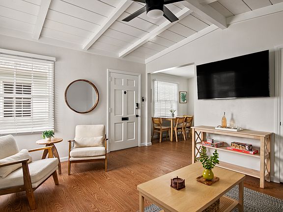 Unwind in your perfect coastal retreat! Breathe easy in this unparalleled property sunshine, shopping, alfresco dining, and beach days are all on the agenda. This inviting space is designed for comfort and relaxation, accommodating up to four guests. The bedroom features a king bed, a desk, a flat-screen 55" Smart TV, closet space, and a ceiling fan, while the living room includes a queen sleeper sofa. The open-concept living, dining, and kitchen area is ideal for gathering, with a dining table for four, ample seating, board games for entertainment, and a flat-screen 55" Smart TV. The fully equipped kitchen boasts all essential appliances, a gas stove, and everything needed for a seamless stay. The renovated bathroom provides all the must-haves for convenience. Step outside to enjoy the thoughtfully designed communal outdoor patios, perfect for unwinding. In addition to shared yard spaces, guests can relax at the bistro table seating, a spacious bar area with stools, and comfortable seating to take in the ocean breeze and stunning sunsets. The space also includes wood-burning and gas firepits, two outdoor showers, and four BBQs for grilling. For added convenience, guests have access to laundry facilities and garage parking. Everything is crisp, clean, and ready for your stay! The entire property encompassing all four units may be rented as a compound accommodating up to 16 guests.