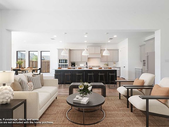 MOVE-IN READY! Home office with French doors frames the entry. Guest suite with a walk-in closet and a full bath. Theatre room with French doors. Kitchen features a large pantry, 5-burner gas cooktop and a large island with built-in seating space. Family room with a wood mantel fireplace and wall of windows. Primary suite with 12-foot coffered ceilings. Double doors lead to primary bath with separate vanities, a freestanding tub, separate glass-enclosed shower, and two walk-in closets. Covered backyard patio. Mud room leads to three-car garage.