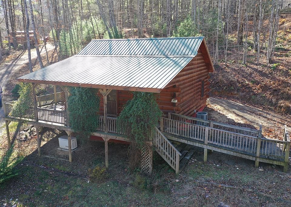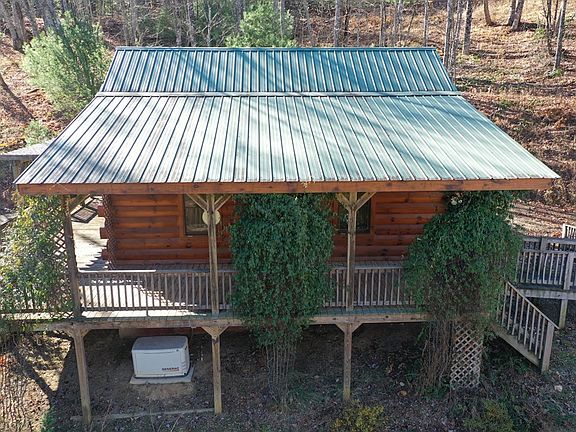 Secluded log cabin nestled in a wooded setting, yet conveniently located just minutes from everyday amenities. This 2-bedroom, 1-bath retreat offers an open-concept living room and kitchen with vaulted ceilings and hardwood floors throughout. A gas-log fireplace provides a warm focal point, while the 280 sq ft covered deck offers the perfect place to relax and enjoy the surrounding mountain breezes. A small creek runs through the property, which also features a small pond, storage shed, and detached carport. Wildlife is frequently observed in the area. The location provides easy access to Exit 8 and Exit 14 off Interstate 77 and is approximately 5 miles from the Blue Ridge Parkway, Crooked Creek Wildlife Area, and the Blue Ridge Music Center.