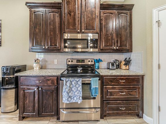 Cozy brick fireplaceAbove-ground poolWood-look tile flooringRaised bed gardenSleek stainless steel appliancesCovered patioLarge center island