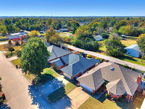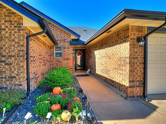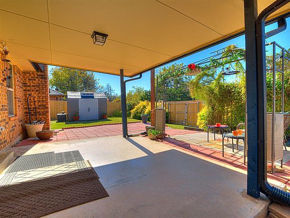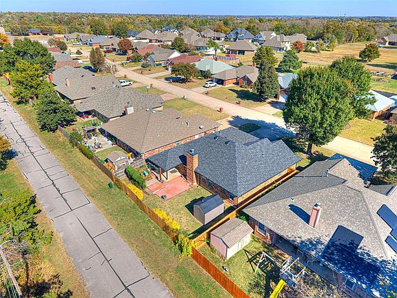 functionality. The cozy fireplace creates a perfect focal point in the living area. The kitchen has ample cabinet space ,Breakfast bar, Enjoy outdoor living with a covered patio, well kept lawn, has a nice storage building, backyard access. All three bedrooms have walk-in closets, storm shelter in garage floor. New roof 2022, new 50 gallon water tank (heater) 2022,new smart thermostat 2023, replaced new hot and cold washer hose bibs 2022, shutoff valve for gas stove installed 2022, new garage door opener installed 2024, new key pad for garage installed 2024, new gas stove 2022, new refrigerator 2022, chimney cleaned & inspected 2022, dryer vent cleaned inside & out 2024. new wood panel fence 2025