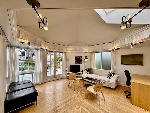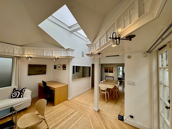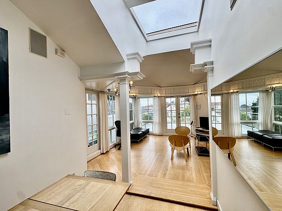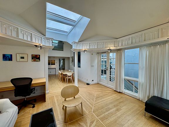 There are 2 bedrooms and 1.5 bathrooms on the primary level. One bedroom includes a loft and a skylight. The other bedroom has a skylight and street views.