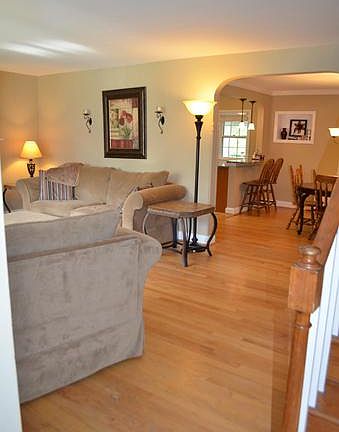 Well maintained open floor plan cape cod with updated kitchen including stainless appliances, granite breakfast bar opening to dining room. Beautiful resurfaced original wood floors on main level. Entire upstairs was converted into a gorgeous luxury master bedroom suite with both tub and multi-spray shower and double vanity. Enjoy the privacy of your private mecca. Fenced and level rear yard.