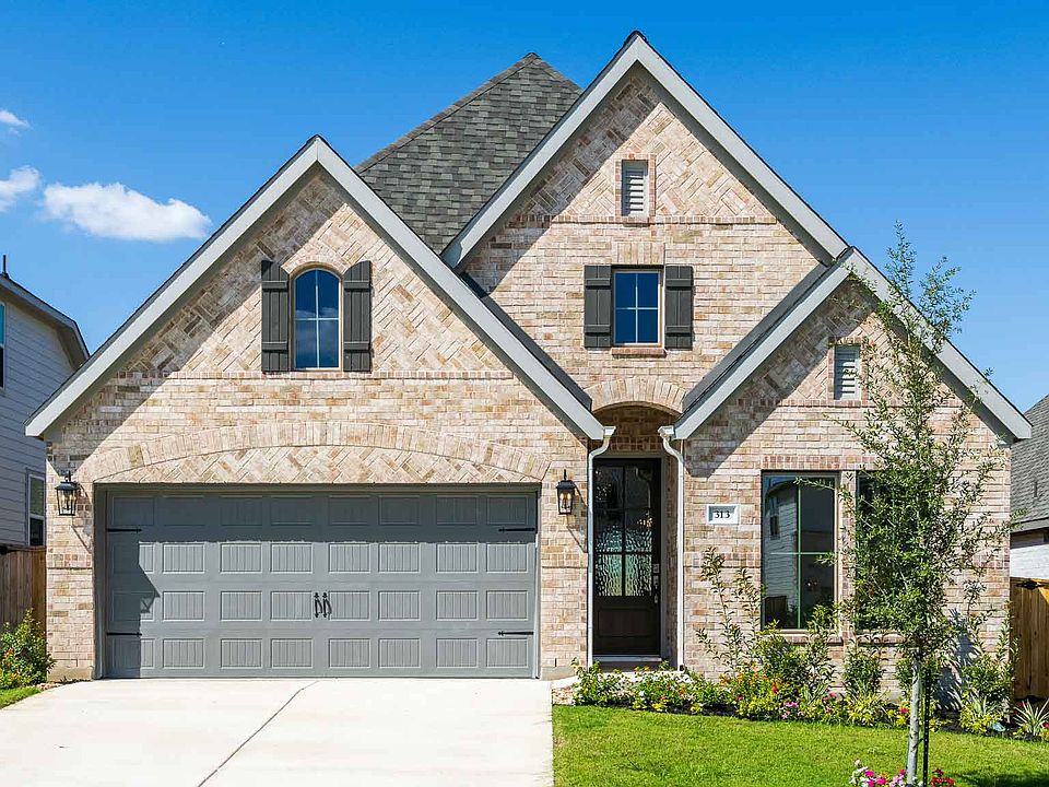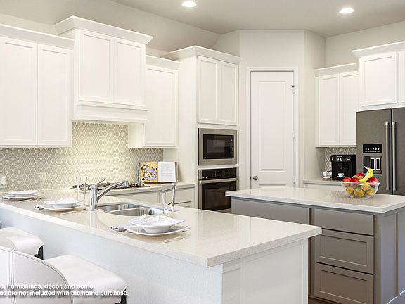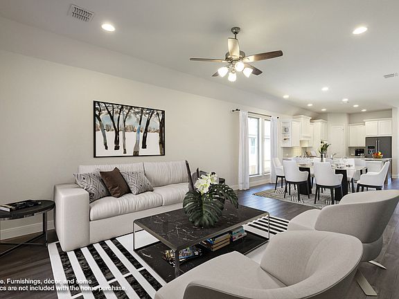 Home office set at entry. Open island kitchen offers walk-in pantry and generous counter space. Dining area flows to open family room with wall of windows. Primary suite includes primary bath with dual vanity, garden tub, separate glass-enclosed shower and walk-in closet. Secondary bedrooms with walk-in closets, a full bathroom with dual sinks and a utility room completes this design. Covered backyard patio. Two-car garage. Representative Images. Features and specifications may vary by community.
