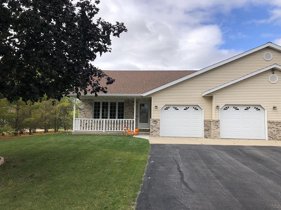 Rare, 1664 Sq Ft, 3 bedroom, 2.5 bath, 2 car garage Condo w/many upgrades! Nice concrete front porch + partial brick exterior. 30ft long great room w/beautiful wood laminate floors, cathedral ceiling + good natural light! Open concept to kitchen w/breakfast nook, newer countertops, great cabinet space +wood laminate flooring. Carpeted Master Bedroom w/private full bath (Shower) + 2 large closets. Other 2 bedrooms are carpeted w/large closets. Full family bath w/tub/shower combination and nice tile. Half bath near laundry room. (All bathrooms have new vanitytops and vinyl plank flooring) The spacious laundry is located near the garage entrance. Patio door off dining area to concrete patio. 4 year old roof. The basement is dry w/high ceilings, ample room for future large rec room + bedroom.