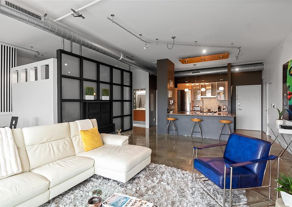 Experience the epitome of urban sophistication in this true industrial-style loft, featuring soaring 11-ft ceilings painted crisp white for a bright, airy feel. Polished concrete floors enhance its authentic city vibe, while 2 bedrooms and 2 full baths offer comfort and style. The gourmet kitchen boasts granite countertops, a glass mosaic backsplash, instant hot and filtered water, plus a brand-new premium refrigerator and LG washer/dryer. A custom room divider with a dual-sided swivel TV separates the living area and guest room, with a recessed TV for sleek appeal. The master retreat showcases a designer accent wall and an opaque glass door for privacy. Modern luxury meets industrial charm in this stunning loft designed for contemporary living.