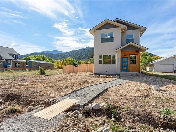 This brand new home is located in a tranquil older neighborhood in Poncha Springs just a block from the beautiful, shady town park and community center. Enjoy walking to coffee, pizza, the gym, restaurants and pubs, or the grocery store from this centrally situated home - or drive 15 minutes to trails or Monarch Ski Area. Enter into a bright, open living area with engineered hickory floors, a gas fireplace with tile surround, and a modern kitchen and dining area with a huge island, quartz counters, stainless steel GE appliances and plenty of counter and cabinet space for all your cooking and entertainment needs. Sliding glass doors lead out to a fenced yard with large concrete patio on the east side of the home for morning sun and summer shade. A large bedroom and full bath complete the main floor. The upper level affords beautiful mountain views in all directions from two huge bedrooms. The primary suite includes a deep walk-in closet, sunny reading nook and a tastefully appointed bathroom with calming spa-like finishes. A full hall bath, full size laundry hookups and extra large storage closets make this level a truly functional space. The mini split heating and cooling system keeps all levels cool (or cozy) year round and your energy bills are kept low by a state of the art EVR (energy recovery ventilator) system which channels outside air in to purify the air, humidify your home and save energy in the process. The home comes with a radon system already installed, as well. The oversized 2 car garage features an EV charging port and plenty of space to add shelves, and a huge tiled mud room where you can keep outdoor gear, pet supplies, and more. Additional alley parking allows you to store an RV, raft, trailer, or extra vehicle. You will be enchanted by the little ditch that flows by your front yard all summer, adding to the charm of this tucked-away location. Landscaping will be completed by mid October and C.O. is expected by the same time.