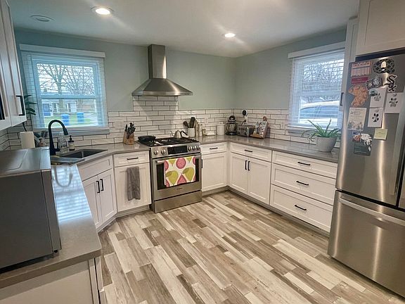 Meticulously maintained and beautifully updated 3 bed, 1 bath home in the heart of Downtown Crown Point. Large living room with vinyl plank flooring & large dining area. Kitchen was completely remodeled in 2021 with beautiful white cabinets, quartz counters, tile backsplash, stainless appliances. Bathroom was remodeled in 2017 down to the studs, new plumbing, new tub/shower & then new vanity in 2024. 3 nice sized bedrooms, large breezeway/laundry room with separate mini split heating & cooling. Attached 2 car garage, fenced yard, and large corner lot! Vinyl siding was replaced in 2017, roof in 2022, deck in 2023, turf backyard in 2019, concrete driveway, garage floor, & landscaping done in 2020.