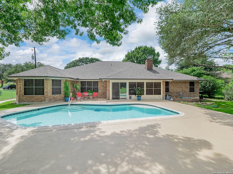**VA Assumable loan at 2.75** Beautiful home featuring 4 bedrooms plus an office, 2.5 bathrooms, and 2,807 square feet of living space, this single-level home includes a spacious living room with a fireplace, two dining areas, and a sunroom. This well-maintained brick home offers tons of space inside and out, sitting on a 0.61-acre lot with access to Lake McQueeney. The home includes crown molding, raised box ceilings, built-in shelving, ceiling fans, and a split bedroom layout with walk-in closets in every room. The kitchen and living areas are bright and functional, and all appliances will stay with the home except the washer and dryer. Energy-efficient features include paid-off solar panels, solar screens, and an all-electric setup. Outdoors, enjoy the in-ground saltwater pool with a new heavy-duty safety cover and surrounding concrete deck. The backyard features a chain-link fence, a shed, and offers ample space for outdoor living and entertaining. Additional updates include a new roof (2025), new deck (2023), new vents and ductwork (2023), new flooring (2018), and freshly painted interior and exterior (2022 and 2025). The attached 3-car garage is complemented by a detached shop with installed cabinets, extra outlets, and attic access. Three new LiftMaster garage door openers are installed across all garages. The property is beautifully landscaped with professionally trimmed oak trees, gutters with leaf guards, a water softener, a concrete wall along the back driveway, and a septic system pumped in 2025. Sellers are very safety-conscious, and this property offers comfort, efficiency, and exceptional outdoor living in a desirable location with neighborhood lake access.