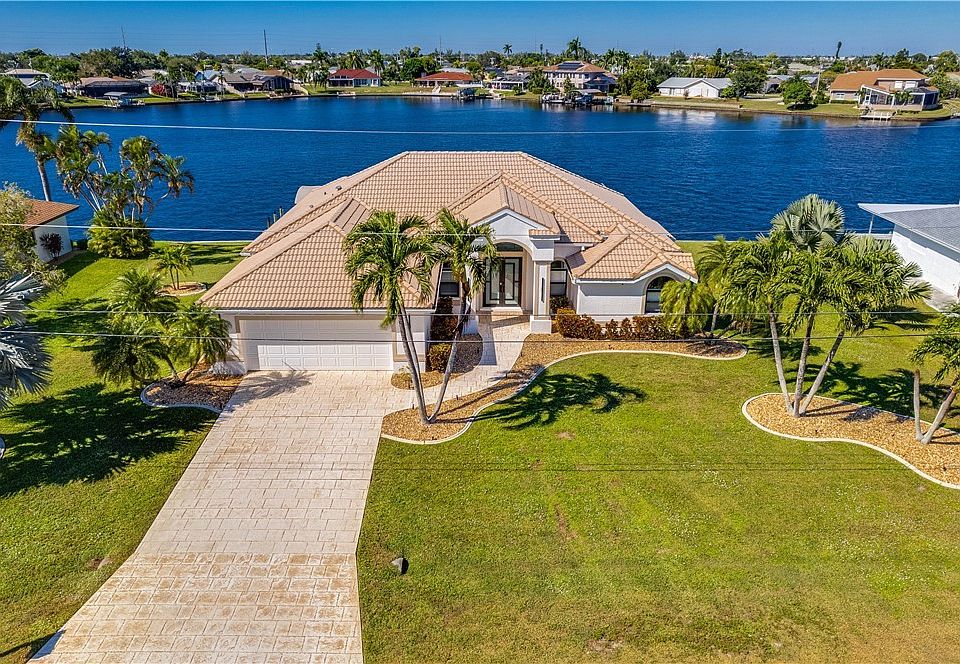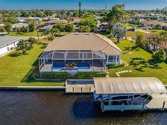 Enjoy a true BASIN VIEW from this stunning GULF ACCESS home overlooking the San Carlos Basin, with breathtaking SUNSETS. Situated on an oversized TRIPLE LOT in a quiet SE Cape Coral neighborhood, the interior features vaulted and barrel ceilings, modern tile flooring, and custom lighting that enhance the open layout. Expansive 8-foot, 90-degree pocket sliders in both the living and dining areas open fully to the lanai, seamlessly blending indoor and outdoor living. The living area also showcases a custom wall with TV and fireplace. The updated gourmet KITCHEN offers wood cabinetry with pullouts, granite counters, a large ISLAND with seating, built-in pantry, message center, and high-end Samsung appliances. PLANTATION SHUTTERS, modern tile flooring, LED lighting, and new custom frosted glass doors enhance the interior design. The MASTER SUITE offers double-door entry, tray ceiling, sliders to the pool, walk-in closet, and a luxurious updated bath with standalone tub, shower, and custom vanity. Guest rooms are spacious— with a view. Guest bathroom has been updated with a modern vanity and walk-in shower. Outdoors, enjoy the new screened CAGE with PICTURE window, resurfaced SALTWATER POOL with waterfall, built-in planter and new pump. The updated SUMMER KITCHEN is perfect for entertaining. New sealed PAVERS in the pool area and pavered steps lead to the wrap-around BOAT DOCK with sitting area, LED lighting, power, water, and covered 14,000-lb remote-controlled BOAT LIFT. Additional highlights include IMPACT WINDOWS and front DOOR, new exterior lights in front, new exterior paint, updated irrigation, and an oversized 2-car garage with a new EPOXY floor and custom cabinet system. Aubuchon-built quality and luxury updates paired with a one-of-a-kind BASIN VIEW make this home the perfect oasis!