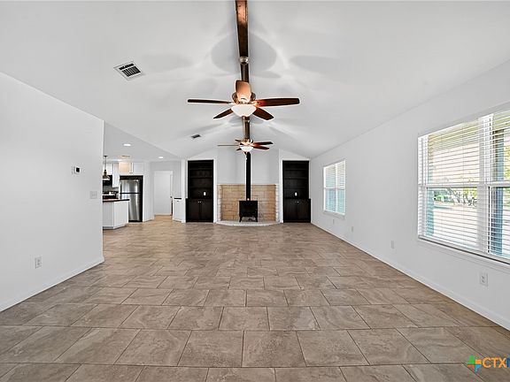 Cozy wood stoveStainless steel appliancesBuilt-in bookcasesTimeless tile floorsButcher block-topped islandPendant and recessed lighting
