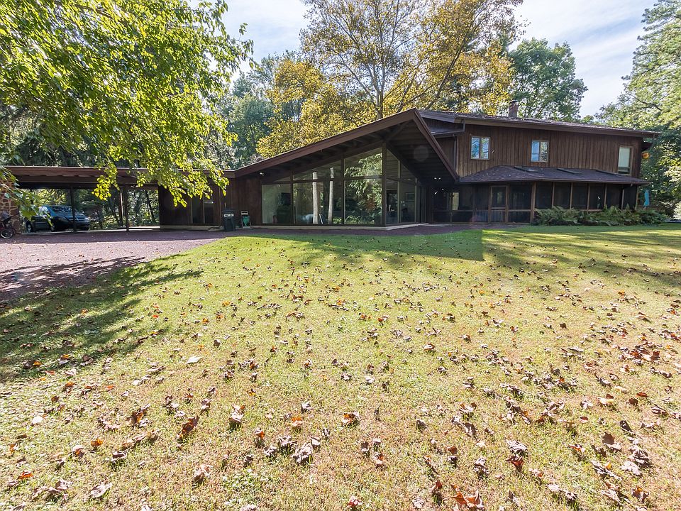 This lovely home features a living room with circular fireplace and walls of windows. Don't miss the wonderful master suite with balcony and immense closet. In-ground pool, sauna, sun room with hot tub, 2.28 acres of wooded lot. One-of-a-kind property.