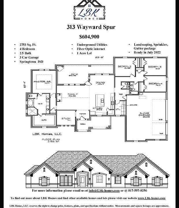 LBK Homes is building a beautiful 1 acre 4 bedroom, study and 3 car garage with 2.5 bath Traditional style home. The home has an inviting foyer that brings out the spacious family room filled with excellent cross beams and craftsmanship throughout. The kitchen is accompanied with an enormous quartz island in the center, microwave, all stainless steel and lg over sized cabinets with up and lower lighting. The Master ste has a large walk in closet a separate claw tub and a separate shower and vanities. Perimeter wall foaming for efficiency. Underground utilities with Nextlink Fiber. Very Close to Schools. Ready July 2022 Sprinkler System with Front Yard sod and 20 ft around sides and back.
