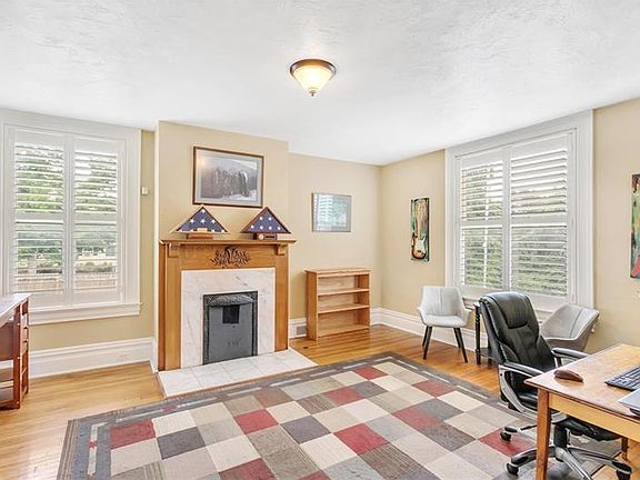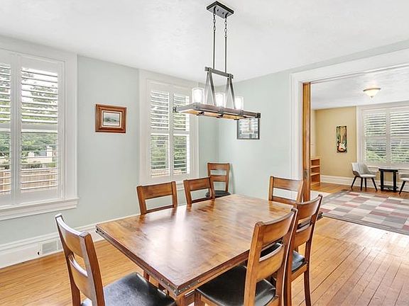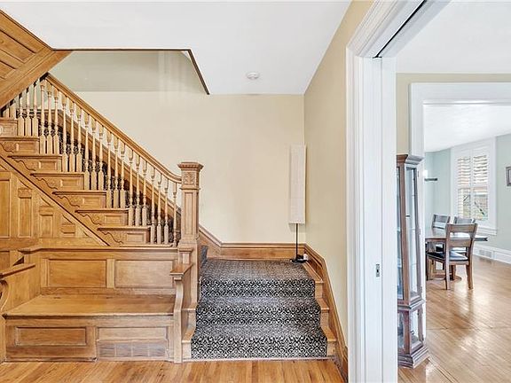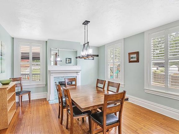 Beautiful details are found throughout this wonderful farmhouse including detailed wood work, built in bench in the foyer, pocket doors, large windows, plantation shutters, stained glass window, 4 decorative fireplaces, eat in kitchen with double sided fireplace, large walk in pantry, updated bathrooms, main floor laundry and finished third floor which can include a guest space or play room. The covered rear deck is perfect for entertaining and over looks a large fenced in flat yard with play set.