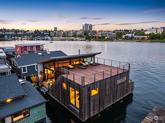 Critically acclaimed and architecturally astounding end of dock Portage Bay floating home is the envy of all who pass by. It has an incredible aesthetic and expert craftsmanship with a mix of warm woods and industrial I-beam construction. The floor to ceiling windows are the real showstopper with unobstructed waterfront views! Soaring tongue & groove fir paneling wrapped walls and ceiling which leads to another row of windows and creates clerestory volume while maximizing the southern light exposure. Deck space is abundant with front and back sitting areas & a large roof top deck. Heated floors and extensive beautiful built-ins add to the ease of living and playing here, plus tie up your boat right to your house! You are now in paradise!