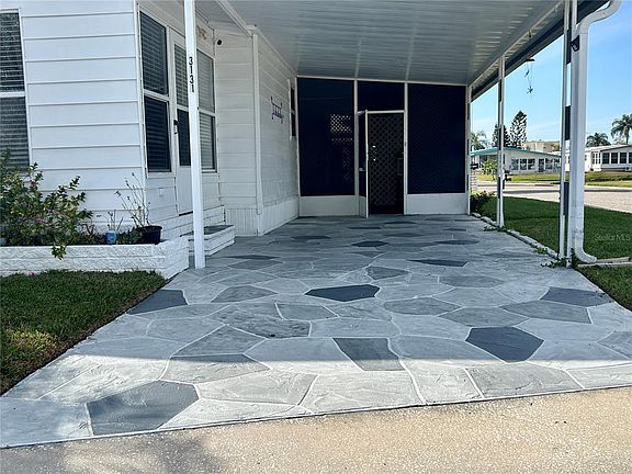 Presenting your new home in the desirable Tanglewood Mobile Village Condominium, a well-maintained 55+ community in Holiday, Florida. This spacious double-wide manufactured home offers 2 bedrooms, 2 bathrooms, and a fully enclosed Florida room, perfectly situated on a corner lot with no CDD fees, no flood zone, and a peaceful pond view. Step inside and immediately appreciate the open floor plan, designed for both comfort and style. The layout flows seamlessly through the window-enclosed Florida room, a fully renovated kitchen, and updated bathrooms and bedrooms. The kitchen is a true showpiece, showcasing white shaker-style cabinetry, granite countertops, and a spacious island with breakfast bar seating. The adjoining dining room features matching cabinetry with a built-in buffet/bar, perfect for entertaining. The spacious living room invites gatherings and opens to the Florida room through double sliding glass doors, enhancing the home’s bright and airy feel. Flooring includes wide-plank luxury vinyl in the main living areas for a cohesive design and porcelain tile in the bathrooms for durability and elegance. The primary suite easily accommodates king-size furnishings and offers a private bathroom, walk-in closet, and ceiling fan. The remodeled en-suite bath features a step-in shower with marble-style tile walls, contrasting dark shower floor, and a granite-topped vanity with matching cabinetry, creating a refined, spa-like atmosphere. The second bedroom includes a custom built-in shelving and desk area, closet, and ceiling fan, making it ideal for guests or a home office. The guest bathroom is equally impressive with a beautifully tiled shower, updated vanity with quartz countertop, and newer fixtures. Recent updates provide peace of mind, including: New A/C (2021), Durable metal roof (2005),Updated electrical panel (2004),Crawl space improvements (2024), and updated windows. Exterior highlights include a covered carport, stamped and painted concrete driveway, storage shed with washer and dryer, workshop with shelving, screened porch, and a backyard patio overlooking the pond. Storm shutters provide added window protection. This property is truly move-in ready. The welcoming 55+ community features a heated pool, shuffleboard, and clubhouse with a variety of social activities, all included in the low $148 monthly HOA fee. Ideally located near beaches, shopping, dining, medical facilities, and local attractions. Schedule your private showing today!