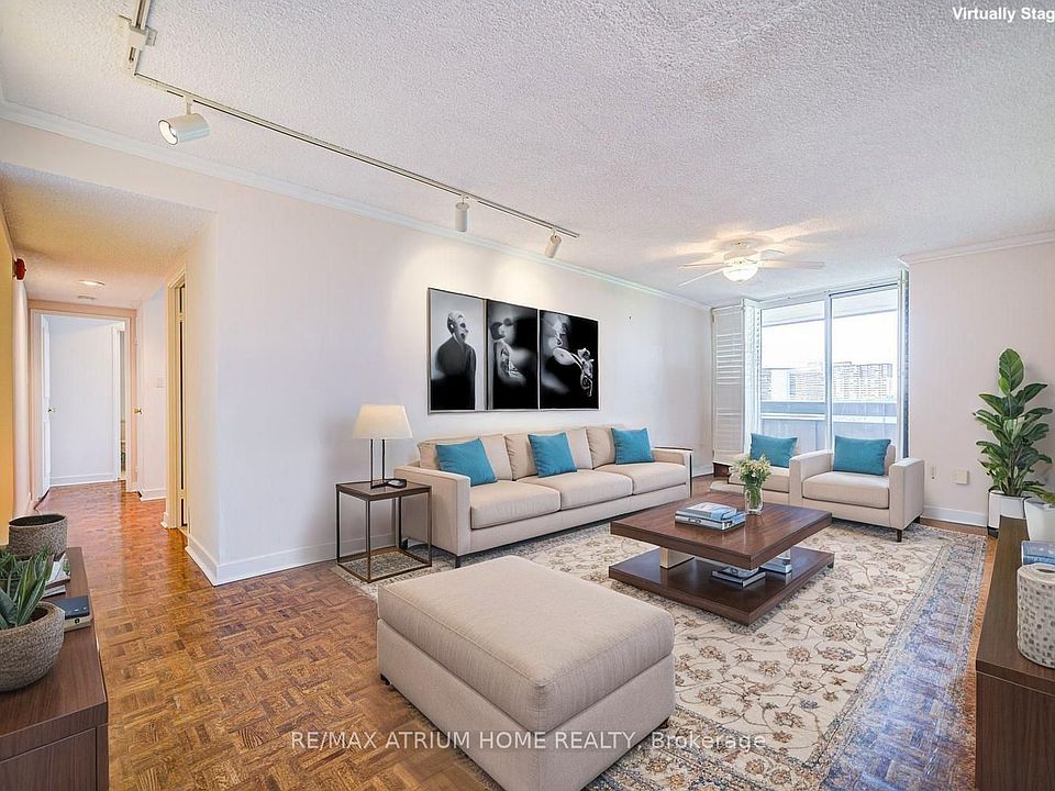 Spacious Tridel 1+Den, 2 Bath (1199 Sqft) with West Views! Large primary bedroom with walk-in closet & balcony walk-out. Generous sized den easily used as office or second bedroom. Kitchen with French door entry and cozy breakfast area. Separate formal dining room for entertaining. Oversized living room with balcony walk-out, perfect for cozy nights in or lively gatherings. Gorgeous greenery views from the 113sqft balcony. All inclusive maintenance fee covers Hydro, Heat, Water, Cable TV, Internet, and Parking. Building amenities include Sauna, Tennis Court, Parking Garage and Security System as well as Visitor Parking, Indoor Pool, Meeting Room, Party Room, Rec Room and Gym. Unbeatable location across from Bridletown Mall, Metro, parks, TTC, and minutes to Hwy 404. Seller/listing brokerage does not warrant the accuracy of any dimensions; buyer/buyers agent to verify all measurements, maintenance fee, and taxes.