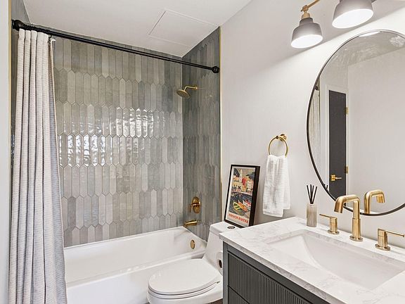 The spacious bedroom offers a peaceful retreat with new carpet, grasscloth weave wallpaper, ceiling fan and walk in closet. The fully remodeled bathroom features a designer vanity, new fixtures, and a beautifully tiled floor and shower.