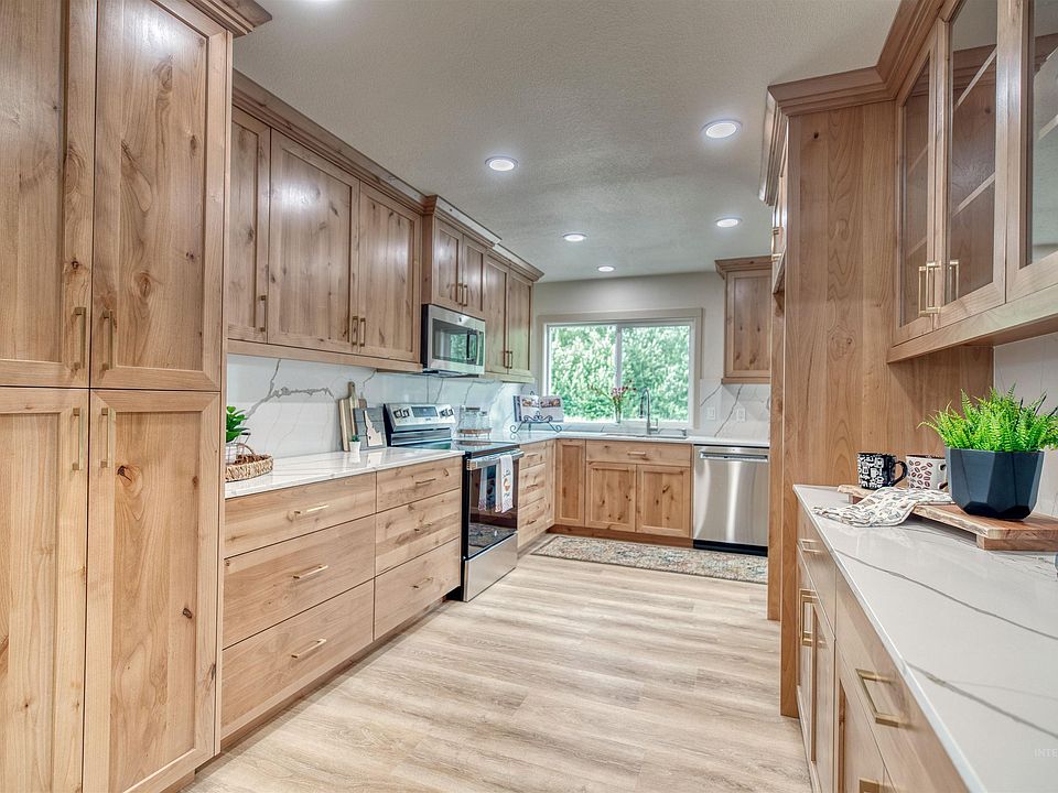 Contingent sale fell through at no fault of sellers.. The house is totally new from the studs out, featuring a state-of-the-art HVAC system, a new water heater, updated electrical work, modern kitchen appliances, custom cabinetry, elegant quartz countertops and matching backsplashes.This stunning residence, nestled in the gem of Idaho, offers a unique opportunity for those seeking a well-equipped, scenic property. The property's location is a major selling point! Conveniently close to Highway 16, downtown Emmett,medical facilities & shopping. The property boasts new windows, a new metal roof with decking, fresh insulation, updated doors and new rain gutter and WELL PUMP=10gpm. The bathrooms have been remodeled with designer finishes, showcasing a large tub in guest bath, remarkable walk-in shower in the primary bathroom en suite and dual closets. You'll be captivated by breathtaking views of the surrounding Squaw Butte. The home is currently listed with 5 Acres. 4.6 acres available for $295,000 see MLS # 98961099 for details.