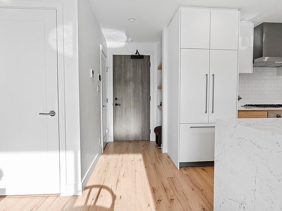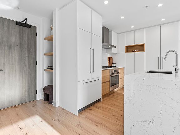 Bright open layoutElegant kitchenFull height pantryOak laminate flooringPolished quartz countersSleek deep bathtub