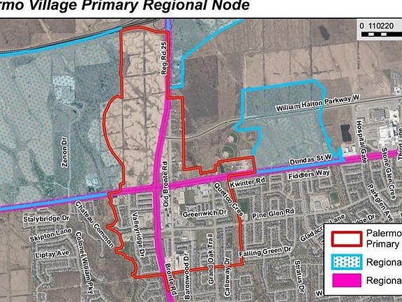 Exceptional High-Density Residential Development Opportunity in Oakville's Palermo Village Growth Node! Strategically positioned on the NE corner of William Halton Parkway and Old Bronte Road, this 1.012-acre flat lot sits within the heart of Palermo Village North Urban Core - a designated growth area in Livable Oakville Official Plan***Key Highlights: *** Located just west of the new Oakville Hospital and Medical Village*** Nature: Glenorchy Forest and numerous sports fields to the east***Zoned for High-Density Residential: Floor Space Index (FSI) of 4.0+ as per ongoing planning studies. Proposed Density: 100-300 units per site hectare under OPA 34, supporting transit-oriented intensification***Prime Location: Just north of the planned community center, library, and regional transit terminal - a future urban hub for the northwest Oakville community***Connectivity: Trail systems linking to Glenorchy Conservation Area and the Trans-Oakville Pathway, with nearby access to Highway 407***Transit: GO Bus Station & dedicated Go Bus lanes have been approved for SE corner of Hwy 407 & Bronte Rd., Inter regional rapid transit terminal approved for north of Dundas & Bronte Rd***Unmatched Views: Future towers will enjoy panoramic vistas of Lake Ontario, Bronte Provincial Park, and the Niagara Escarpment***Complete Community Vision: Palermo Village is set to become a vibrant, pedestrian-friendly, mixed-use node with commercial, office, civic, and residential uses***This is a rare opportunity in a fast-developing growth area anchored by regional transit infrastructure, civic facilities, and high density residential-use intensification ideal for developers, institutional investors, and strategic landholders. Several adjacent 1-acre+ lots might be available as well. OFFICIAL PLAN DESIGNATED - RESIDENTIAL USE, OFFICIAL PLAN DESIGNATED