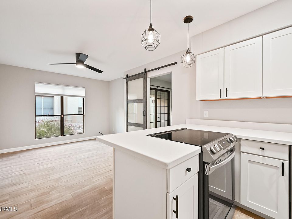 Recessed lightsBlack out bedroom curtainsWhite shaker cabinetsBarn doorQuartz countersPendant lightsSlide in upgraded stove
