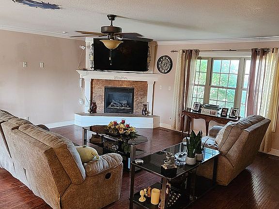 Open Floor Plan: Spacious living room (with gas fireplace), dining area, and kitchen flow together seamlessly. Full basement with wood burning fireplace.