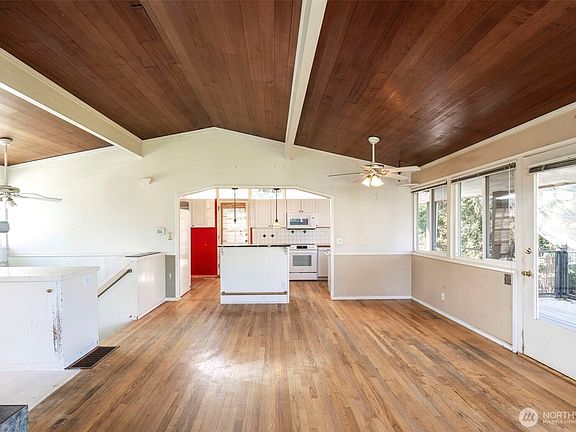 Charming 2-bed home in sought-after UP, featuring bursts of natural light throughout w/vaulted & open beam ceilings! Enjoy partial mountain & Sound views from the recently-installed Trex deck! Large, fully-fenced, flat yard w/RV parking. Spacious great rm flows into an open kitchen with loads of cabinets (all appliances stay)! Office/dining rm & half bath on main. A/C. Wood & vinyl plank floors. Two fireplaces create a cozy vibe! Bedrooms w/builtins (1 w/frplc), full bath & laundry rm on lower level. Storage galore! Patio on side of home, great add'l space for bbqs & relaxation! Vinyl siding. Detached 1-car garage. Add'l ingress/egress parcel to side driveway. U.P schools! Close to Chambers Bay, Town Center, Trader Joe's, parks & more!