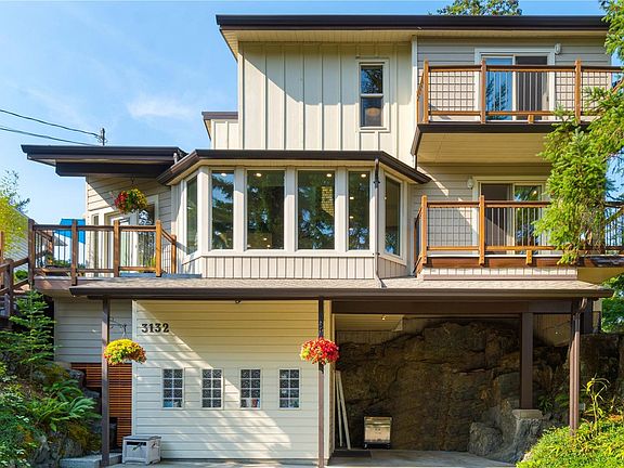 West Coast Contemporary home with forest views in Nanaimo’s treasured Sherwood Forest. Linley Valley Park trails 1 block away & walk to Departure Bay Beach. Enjoy unmatched privacy, peaceful mornings & golden sunsets. Lovingly maintained by the owners for 35+ yrs, fully renovated & ready for a new family. Soaring vaulted ceilings, expansive windows, multiple decks & balconies with sliding glass doors flood the home with light & showcase treed & mountain vistas. The custom Merritt kitchen is a true showpiece featuring Cambria quartz counters with waterfall edge, Bosch appliances & coffee bar. Beautifully renovated main bathroom with soaker tub. New flooring, paint, updated plumbing, electrical & lighting. Stunning floor to ceiling fireplace. Custom railings lead upstairs to 3 bedrooms with plush wool carpets & the 2nd bathroom. Outside find a storage mezzanine above the wired workshop/bike storage. Book your showing to visit this unique sanctuary in the city. Measurements approximate.