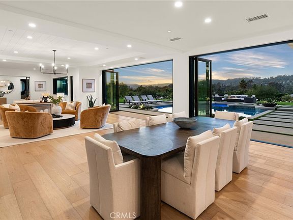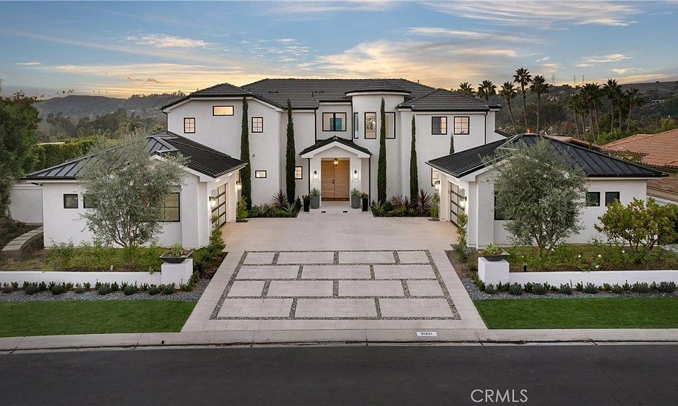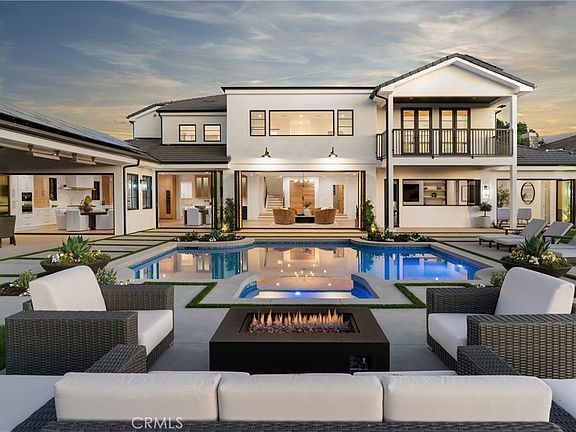 Perched at the end of a quiet cul-de-sac in the prestigious Hunters Creek community, this newly reimagined Modern Farmhouse represents the pinnacle of design, craftsmanship, and California living. Every inch of its 6,400 square feet has been thoughtfully rebuilt to exceed modern luxury standards while preserving warmth and character. Set on a 24,750 square foot lot with sweeping panoramic views of rolling hills, the home offers a rare blend of scale, serenity, and sophistication. Completely reimagined from the ground up with new plumbing, electrical, roof, and four HVAC systems, it combines timeless architecture with advanced performance. Smooth stucco graces the interior and exterior walls while oversized iron clad Marvin and Andersen windows fill the home with natural light and frame spectacular vistas. Inside, white oak hardwood floors, smooth walls, and modern flush doors with silver trim reflect a commitment to detail. The open concept great room features a statement marble accent wall, custom built cabinetry, and five expansive Cantina bifold doors that create a seamless transition to the California Room and outdoor living spaces. The chef inspired kitchen centers around an almost 14 ft Calcutta marble island and adjacent a 60" Wolf dual fuel oven, two 72" Sub Zero refrigerators, and built-in wine cooler by Sub Zero, a Miele coffee system, and both a butler’s pantry and walk-in pantry with custom millwork. Each of the five ensuite bedrooms is a private retreat, including the primary suite which captures sweeping sunset views from its private balcony and features a spa inspired bath with stone finishes and dual vanities. The open riser staircase, sculptural metal railing, and seven inch baseboards reinforce the home’s refined design language. Additional features include a main floor office, bonus room, mudroom, integrated sound system, smart home automation, owned solar, upgraded insulation, and PEX plumbing. Outdoors, the re-pebbled pool and spa are complemented by a water efficient landscape and architectural lighting that highlight the home’s contemporary lines. A four car-garage with modern doors, low HOA fees, and no Mello Roos complete this exceptional property. Every feature, finish, and system has been chosen to create a cohesive expression of modern elegance, comfort, and enduring California beauty.