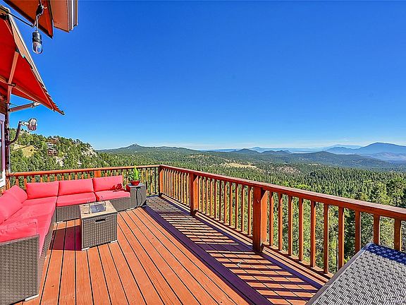 Discover the most Spectacular Panoramic Mountain Views in this inviting 4-bedroom home located in Kings Valley. Positioned amidst striking rock outcroppings and tall pines, this house offers stunning views of Pikes Peak and more. The residence features amazing wrap-around decks on multiple levels, perfect for enjoying the natural surroundings and taking in the beautiful scenery. The open floor plan allows for plenty of natural light, enhancing the hardwood floors and vaulted ceilings throughout the main living areas. The living room is bright and open with amazing mountain views, featuring a unique double-sided gas fireplace, providing a cozy ambiance. The large kitchen is designed for both functionality and style, equipped with stainless steel appliances and a gas stove. The center island includes seating, making it an excellent space for meal preparation or casual dining. Additionally, there is an abundance of counter and cabinet space, ensuring ample storage. The entire upper level is dedicated to the primary suite, which is a spacious and private area complete with a spa-inspired bath, a fireplace for added warmth, and three walk-in closets, including a dressing area. The walk-out basement hosts three generously sized bedrooms that share a guest bathroom and family room making it ideal for family or guests. An attached two-car garage provides convenient and secure parking. The property is situated on a county-maintained road and is close to a school bus route, adding to the ease of transportation. Conifer is a desirable location known for its serene mountain setting and community vibe. Residents have easy access to outdoor recreational activities given the proximity to hiking trails and parks. Despite the feeling of seclusion, essential amenities and services are within a short drive, making it a practical choice for everyday living. **Seller is willing to offer a $5,000 rate buy-down credit with an acceptable offer.